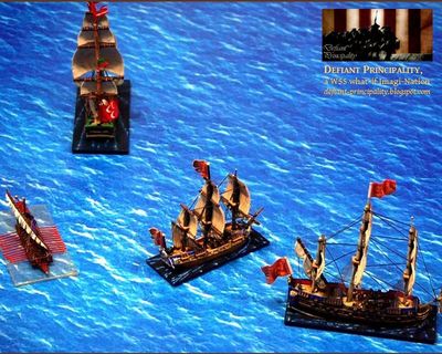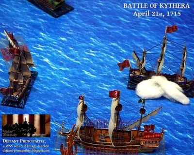 ESCENARI: Vista l'enorme desproporció d'ambdues forces (de 10 a 1, ben bé), els jugadors vàrem acordar de reescalar la batalla, i també du subdividir-la en dos enfrontaments separats, sota la següent premissa: si l'estol venecià, representat per 1 navili i 1 fragata, aconseguia escapar del segon esquadró enemic per l'extrem oposat al del seu desplegament, hauria tingut èxit i hauria escapat de la pinça parada pels otomans. Aquests hi serien representats per 1 navili, 1 galió, 1 galiassa, 1 xabec gran i 1 galiota.